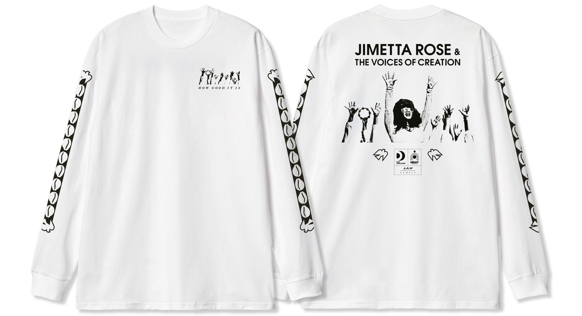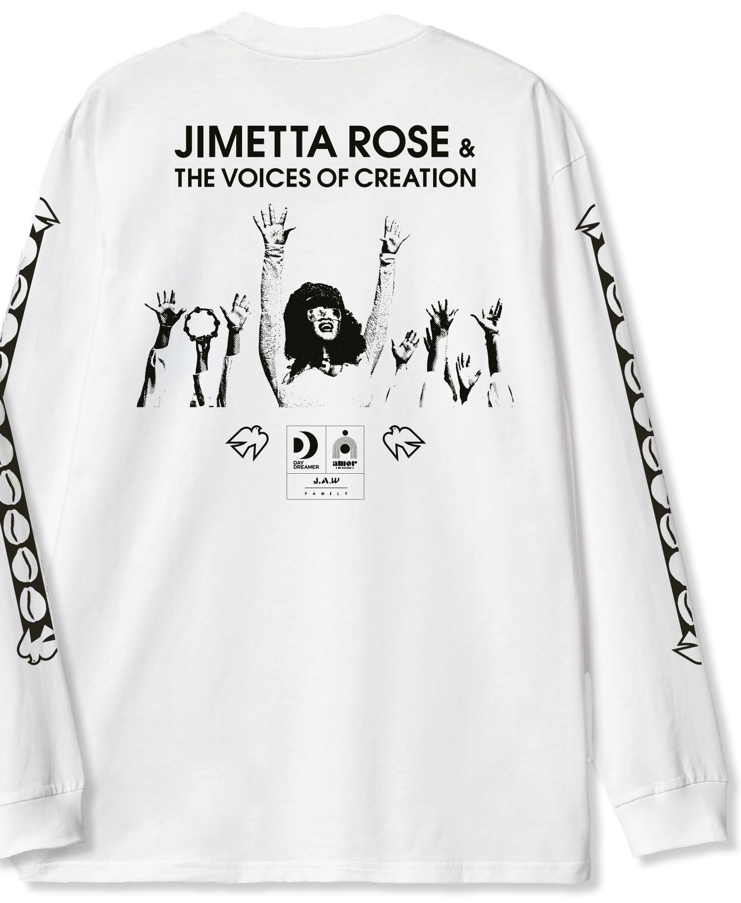Limited Edition shirt produced for the Jimetta Rose & The Voices of Creation August UK/Germany tour, made by Carhartt in long sleeve white shirt with black detail
