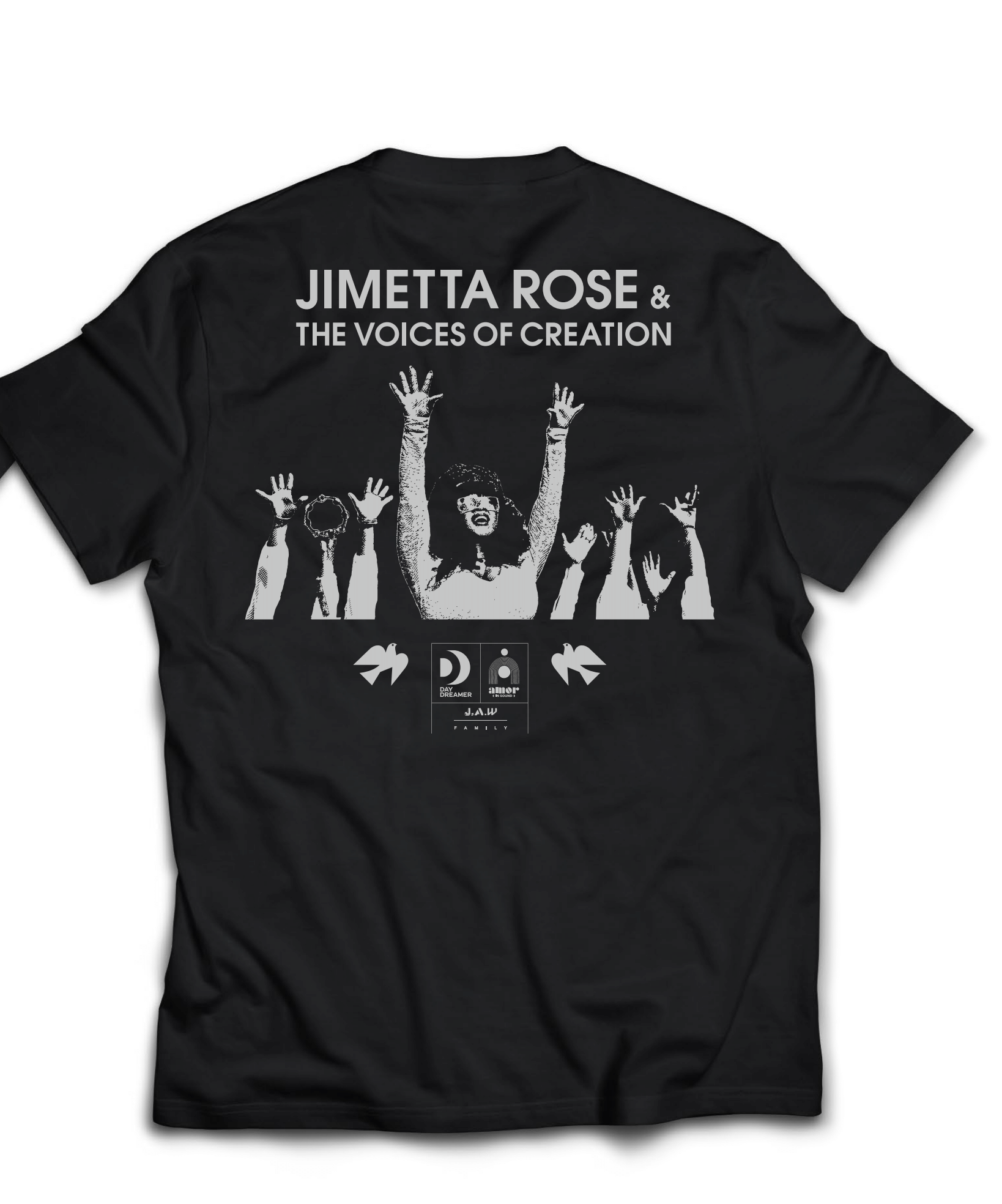 Limited Edition t shirt produced for the Jimetta Rose & The Voices of Creation August UK/Germany tour, made by Carhartt in short sleeve black shirt with grey detail