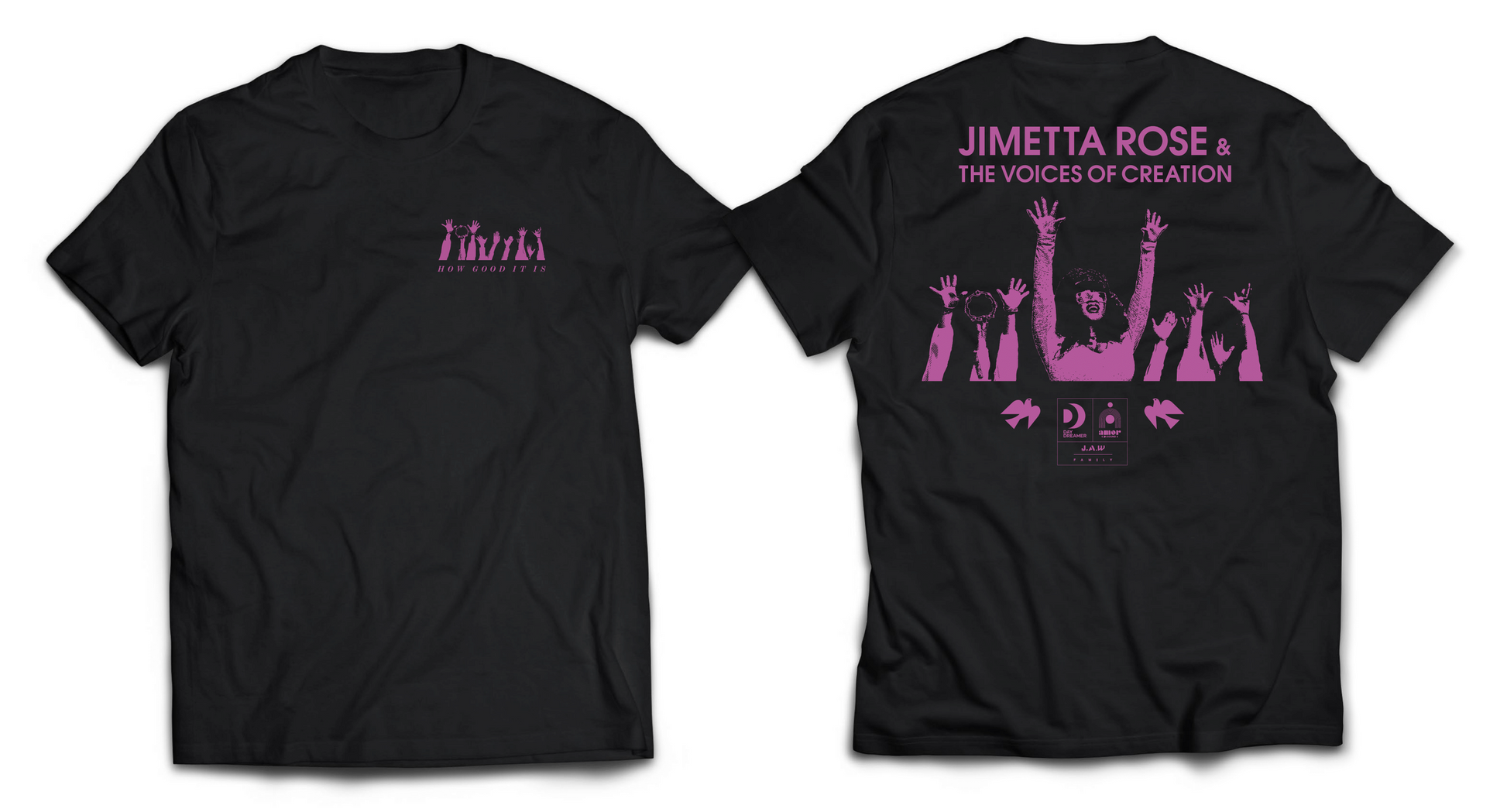 Limited Edition t shirt produced for the Jimetta Rose & The Voices of Creation August UK/Germany tour, made by Carhartt in short sleeve black shirt with pink detail