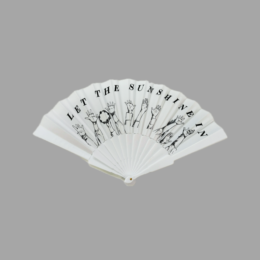 White hand fan with ‘Let the Sunshine In’ print made for the August UK/Germany tour